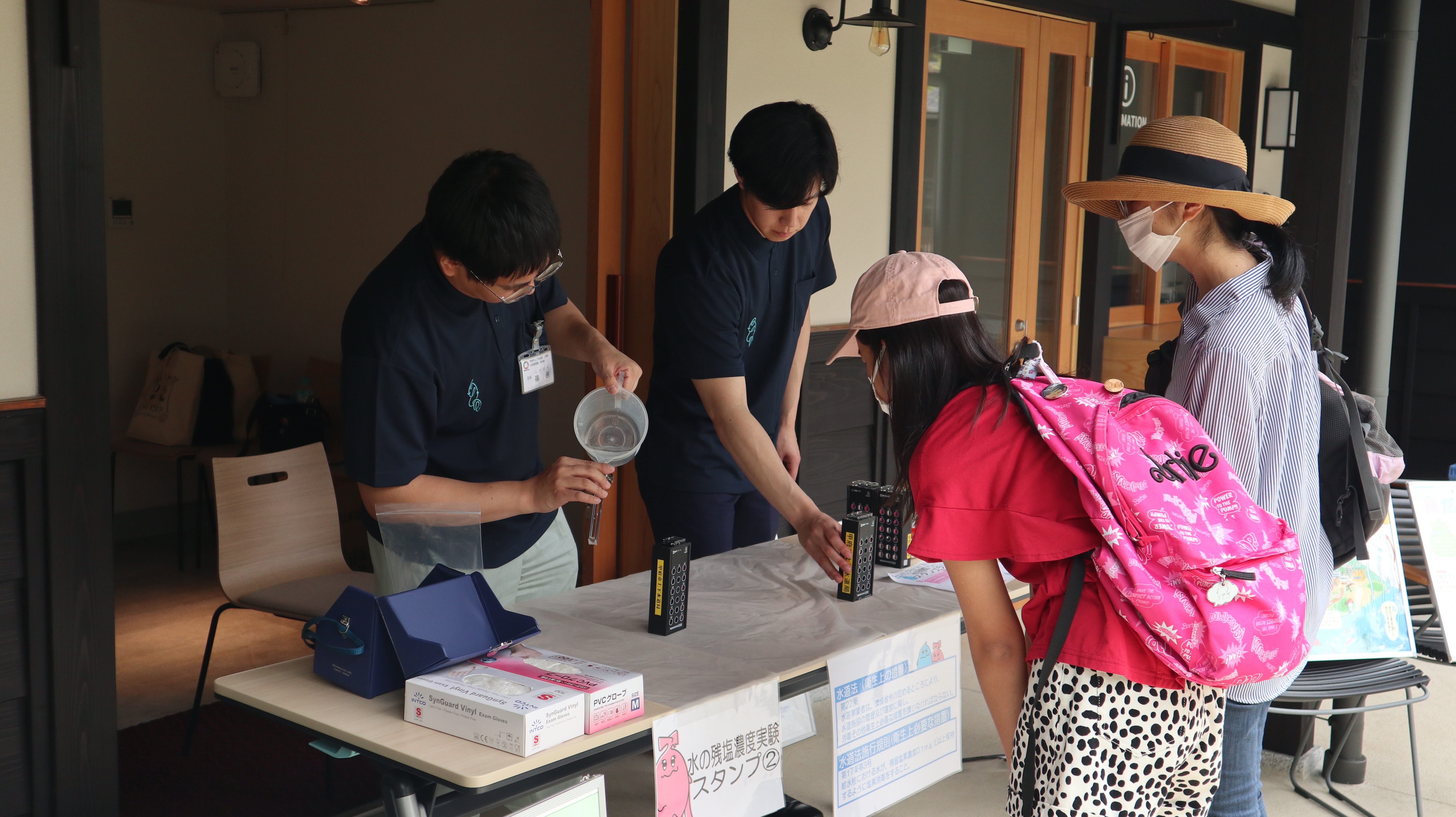 参加者はまず、受付で「水の妖精WATTS(ウォッツ)」のスタンプラリーの台紙を受け取ってから、「水のろ過実験」、「残留塩素濃度を測る実験」、「給水スポット」の体験をしてもらいました。