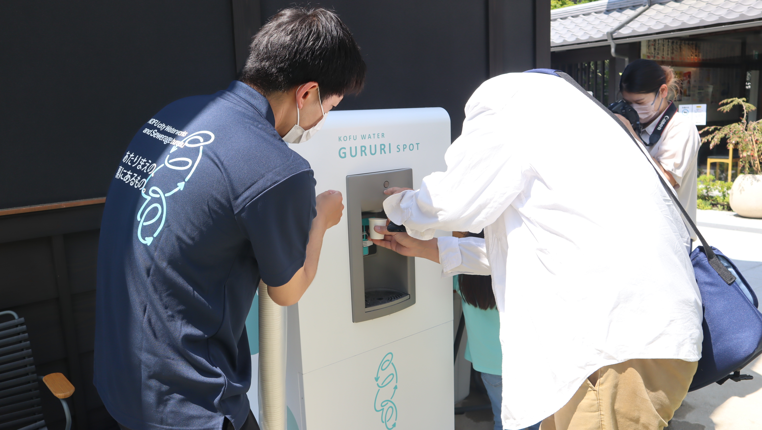 「給水スポット」では、実験で甲府の水について理解を深め、冷たく、おいしい甲府の水を飲んでもらいました。